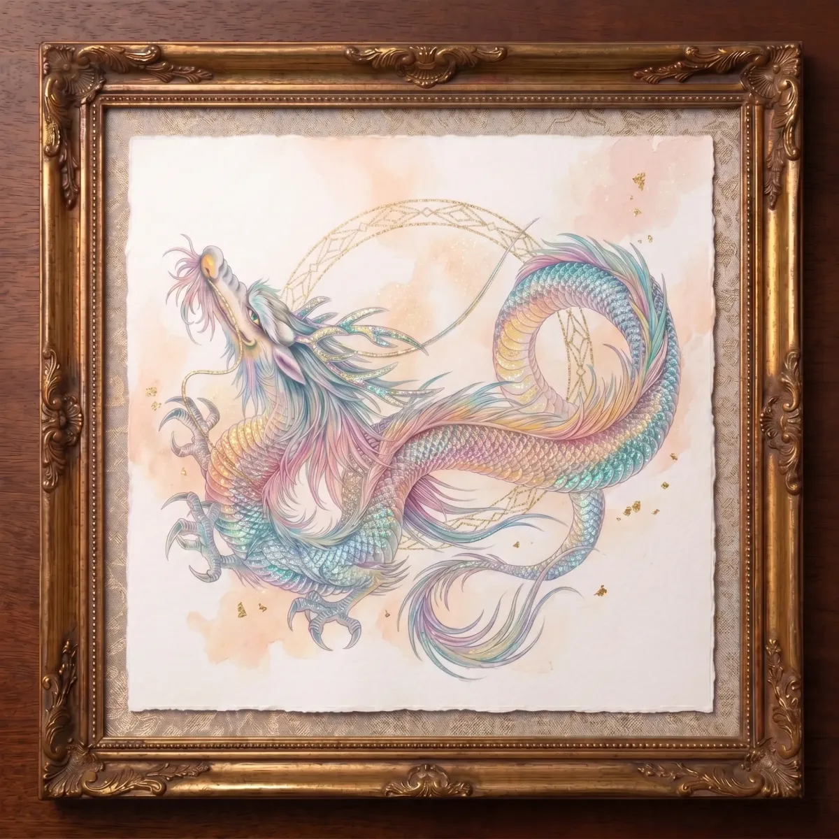This is the most breathtaking painting in the collection: a flowing Japanese dragon in soft iridescent washes — rose, mint, pearl — with scattered gold catching the light against a warm, dreamy blush sky.